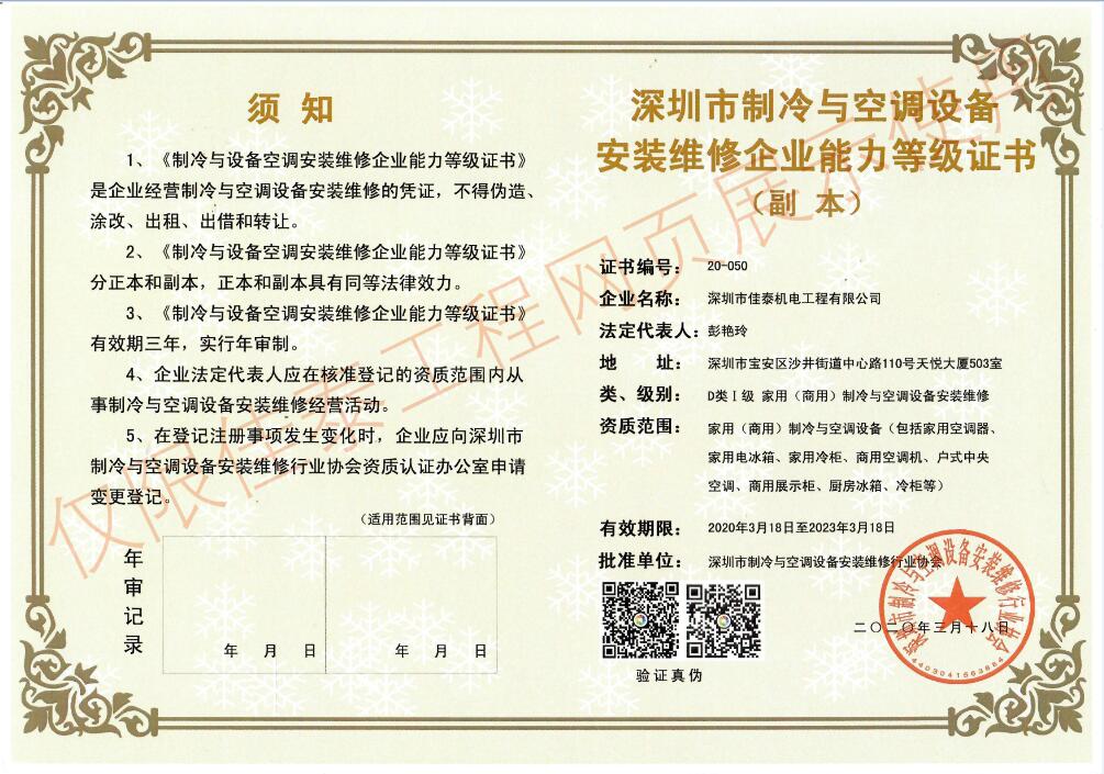 制冷與空調(diào)設(shè)備安裝維修等級證書