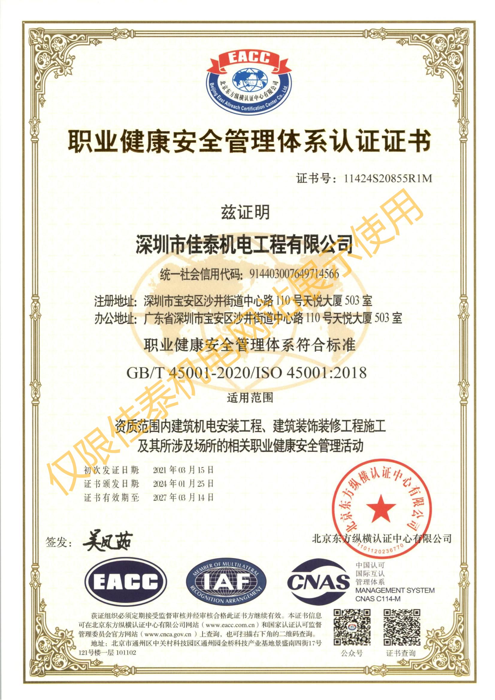 職業(yè)健康安全管理體系認(rèn)證證書